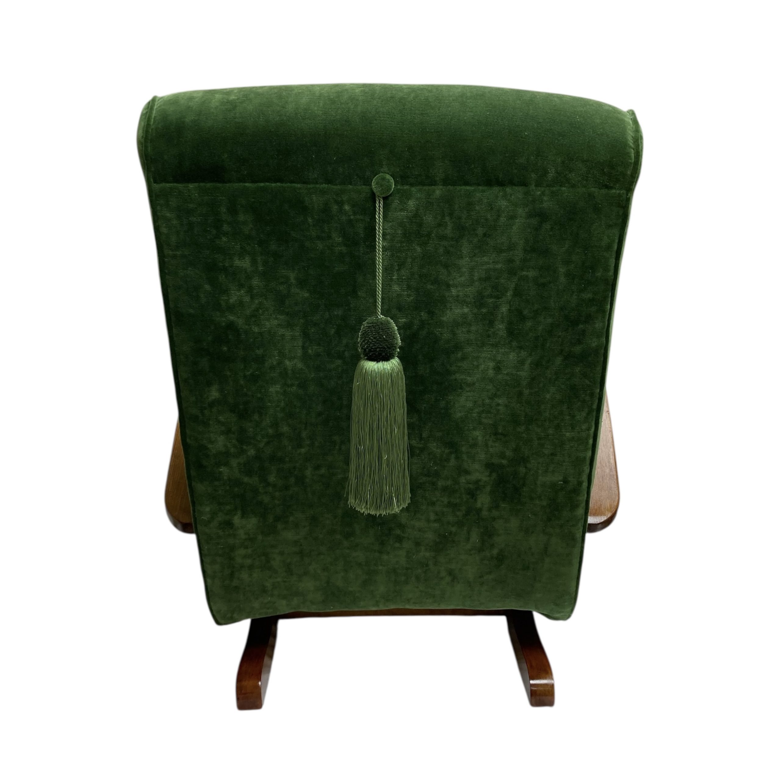 Set on a rocking base with sweeping bentwood arms, the chair is distinguished by its fully sprung seat and back – not just cushioned, but traditionally upholstered to provide lasting support and exceptional comfort. It is covered in Linwood Velvet Pine, a rich and luxurious deep green that perfectly complements the warmth of the bentwood frame.