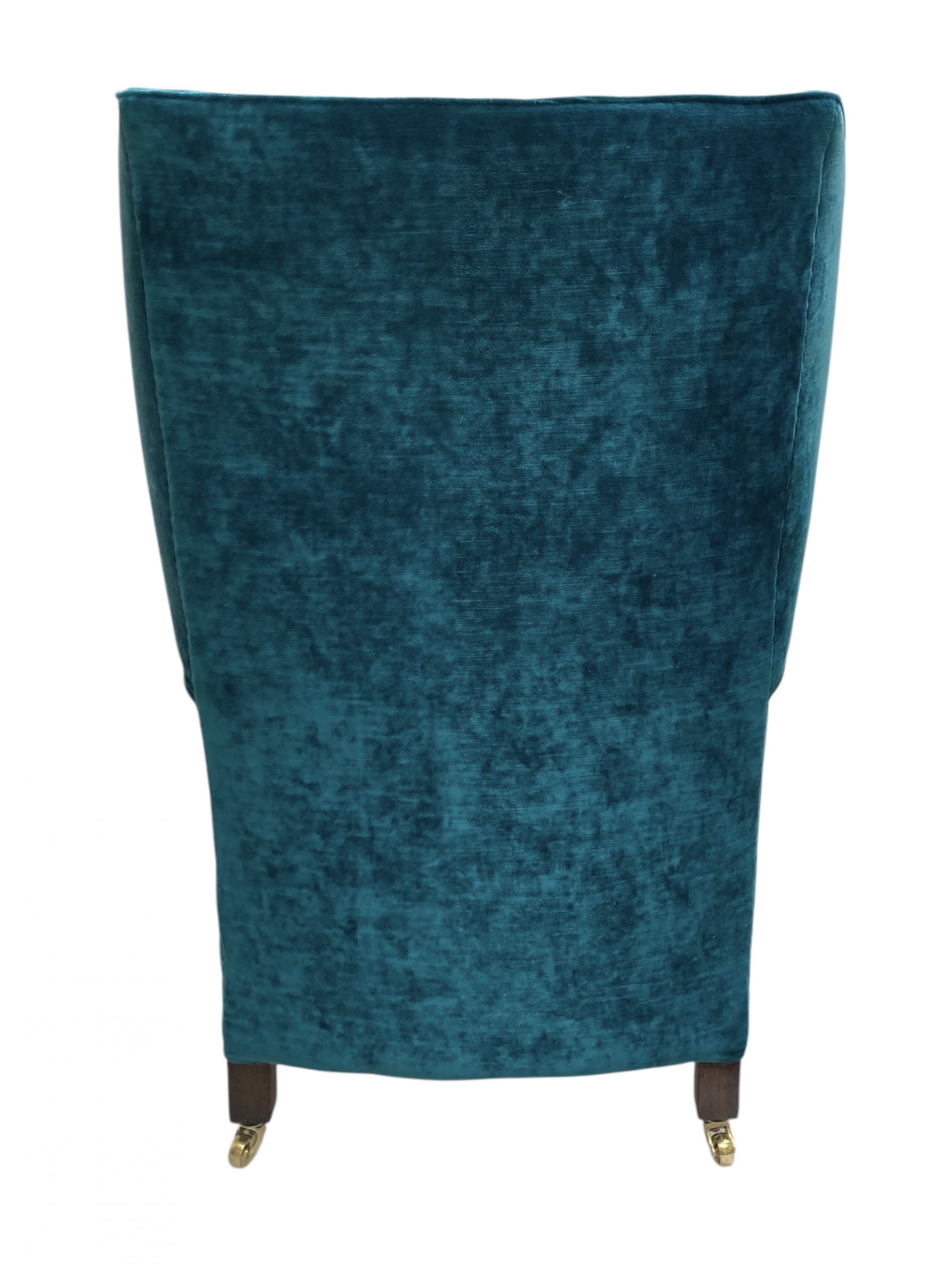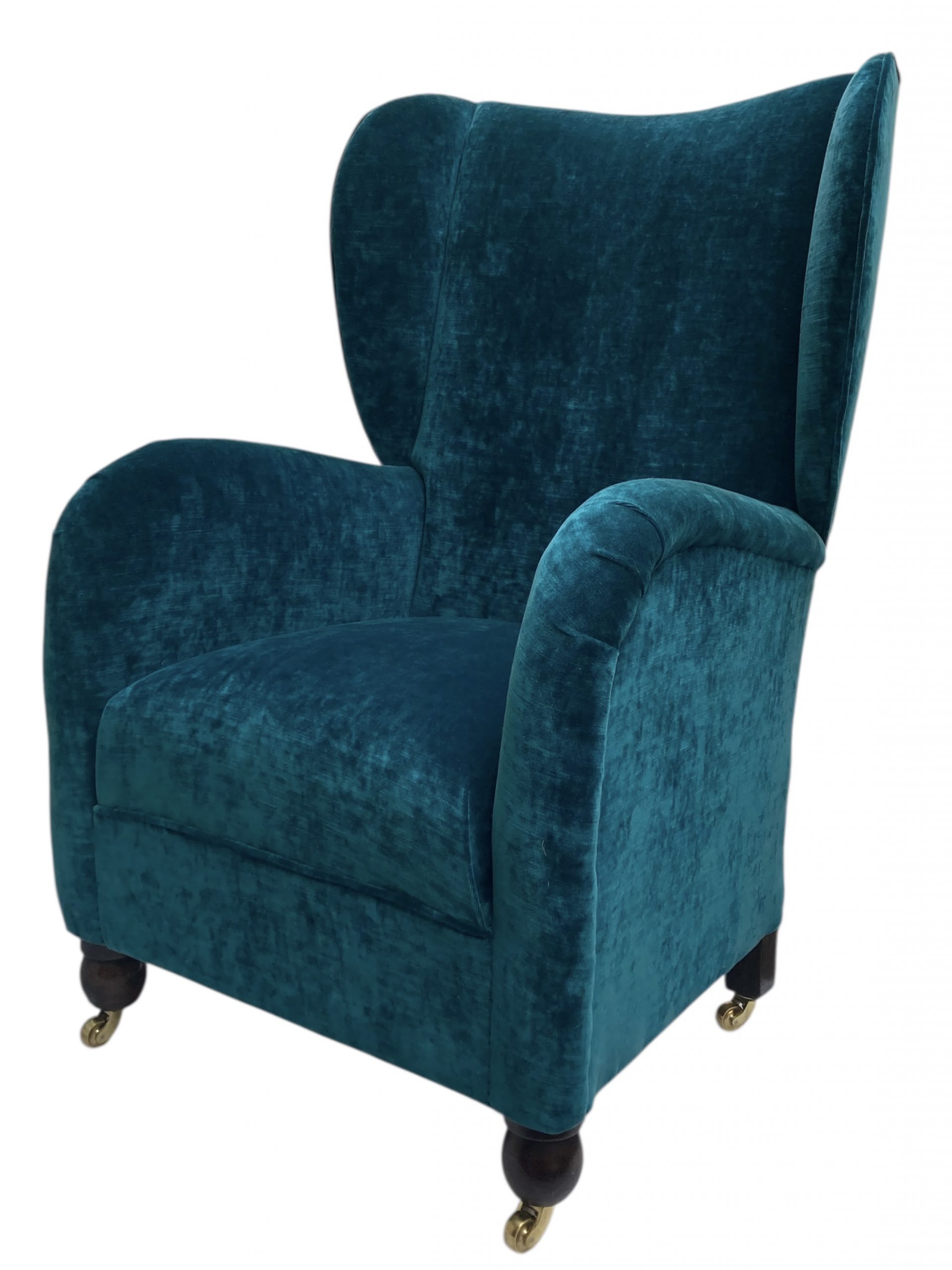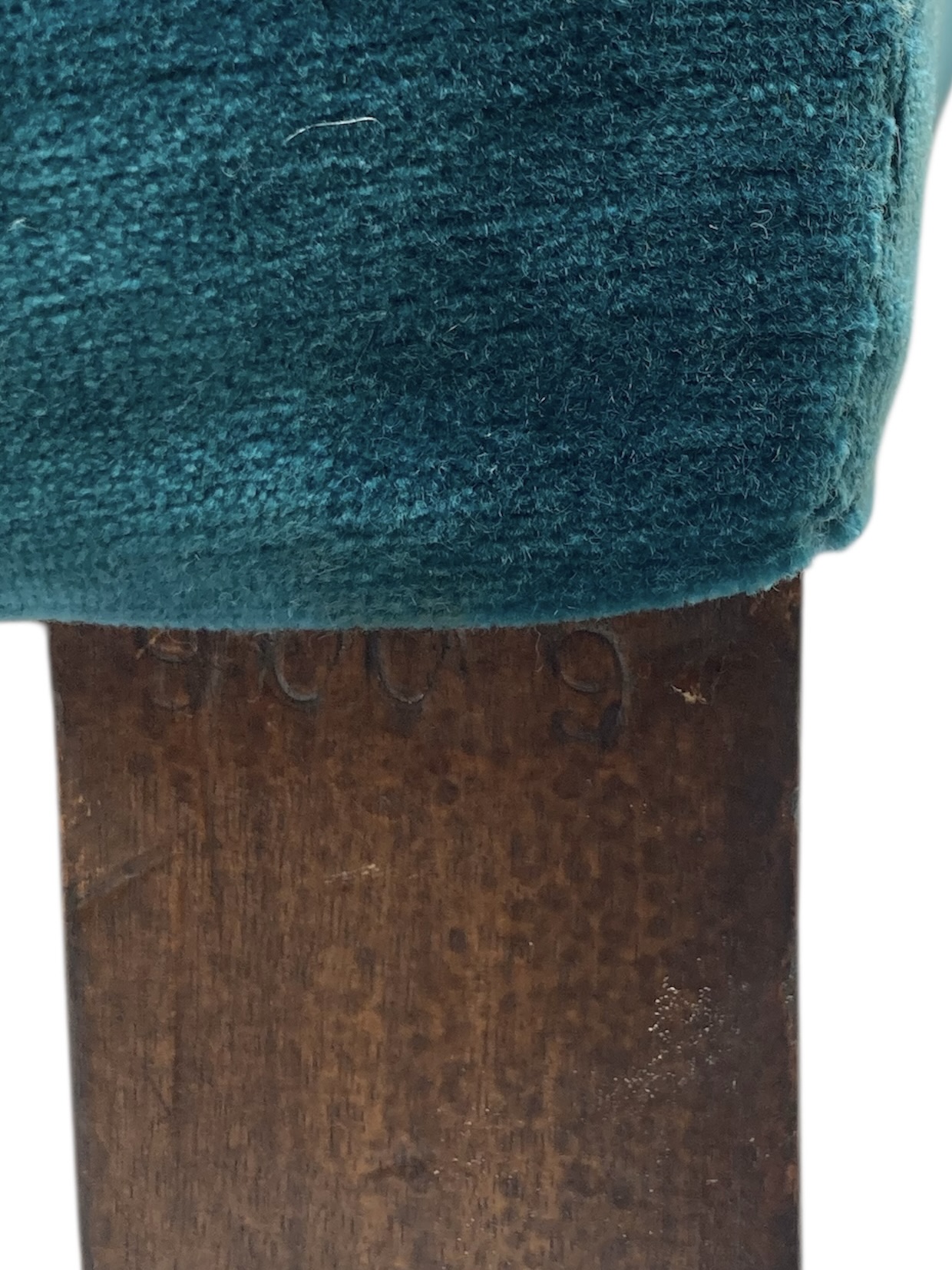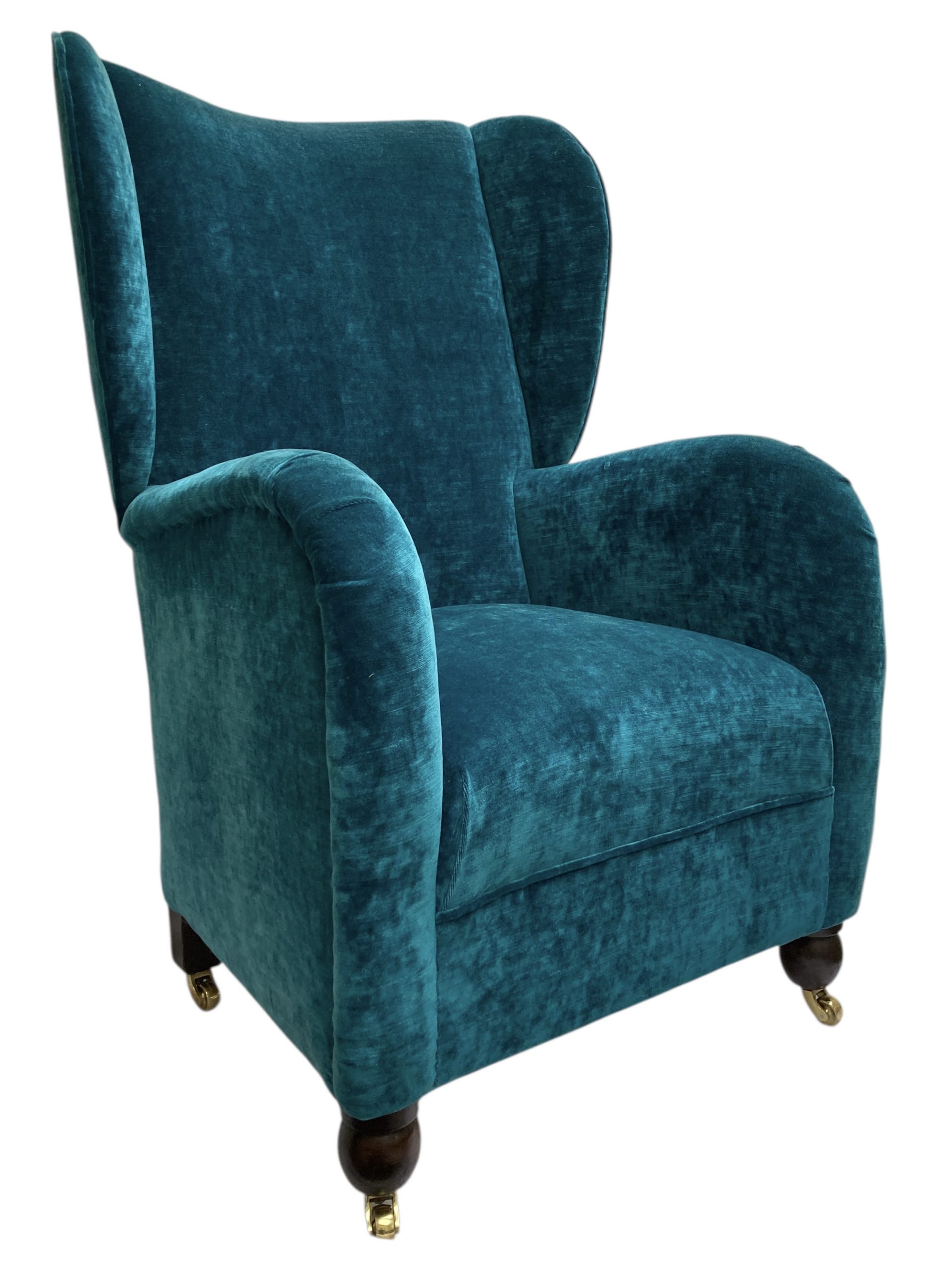Recently reupholstered in luxurious Linwood “Cosmos Velvet” No. 15 Teal, the fabric’s rich tone and soft, lustrous pile accentuate every curve of the chair’s silhouette — from the rolled arms to the gentle flare of the wings. The frame is stamped to the rear leg with the original production number, a quiet mark of its early manufacture and authenticity.