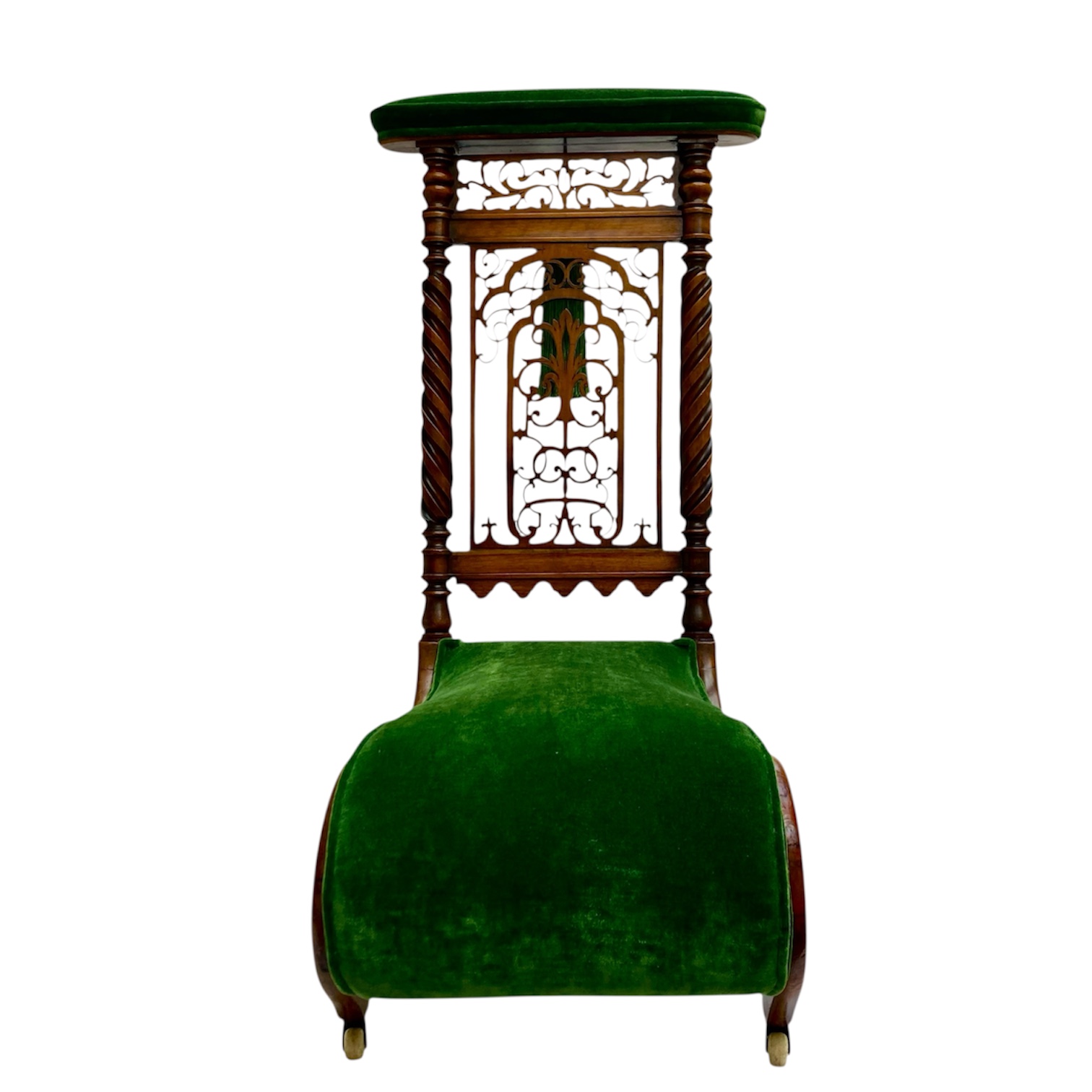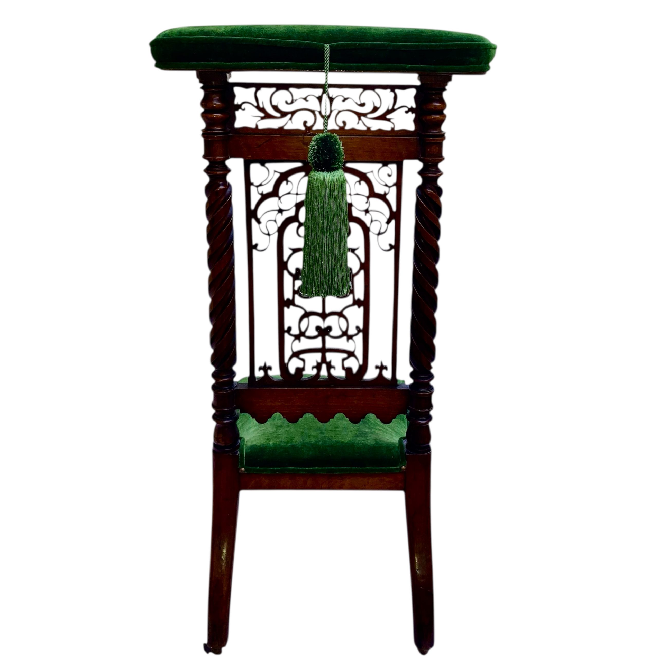An elegant Victorian prie dieu (prayer) chair, circa 1870, finely crafted in mahogany with a richly carved openwork backrest featuring gothic-inspired tracery and twisted side supports. The seat is upholstered in luxurious deep green velvet, complemented by decorative silk green tassels that enhance its ecclesiastical charm. Its distinctive serpentine-shaped seat curves gracefully downward, designed for kneeling in prayer while providing comfort and stability. The flowing mahogany frame rests on small castors, making it easily movable. A beautiful example of devotional furniture, this piece combines spiritual purpose with refined Victorian design, making it a striking addition to any antique collection or interior.